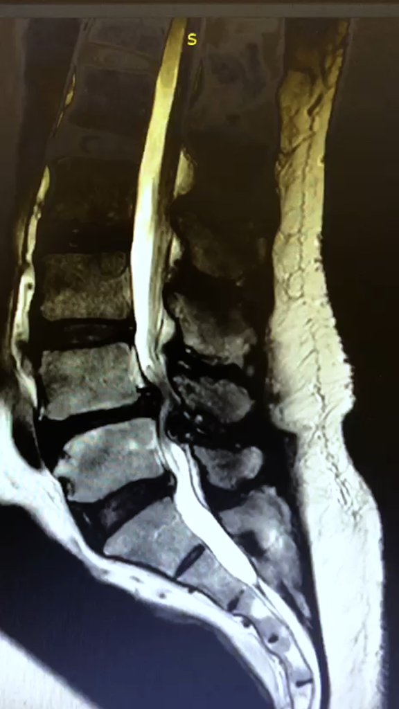 Ressonância magnética evidenciando aperto significativo do canal lombar entre L4 e L5, com redução importante do espaço disponível para as estruturas nervosas.